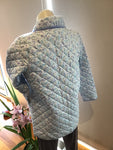 This Bed Jacket has a nice collar and 2 large pockets in a pretty Liberty print with a pale blue piping and large easy buttons.