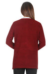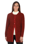 Boucle knit cardigan with a plain knit band around the neck and down the front with 3 button closure at the top, 2 front pockets.