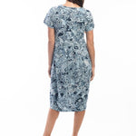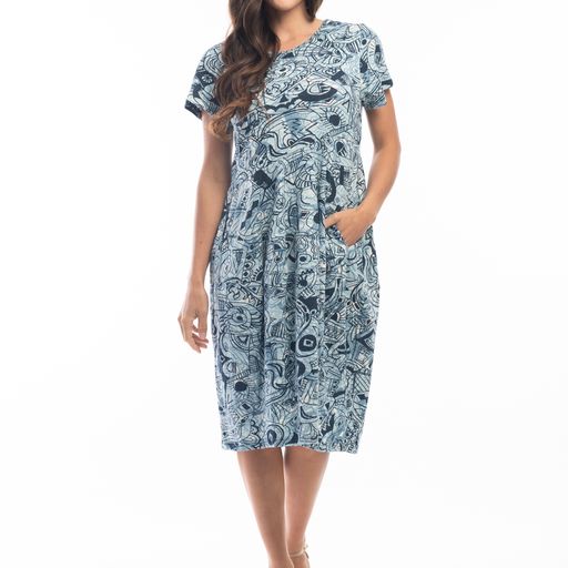 Round neck, short sleeve dress in a bubble style with a pocket in the front, blue and navy print.