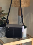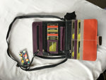 In multi colors big enough to carry a passport, phone and large amount of cards with pockets front and back and a pen holder on the inside as well as 4 zip pockets on the inside. It is a bag an wallet in one.