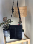 Multi colored handbag with Olive beige and red panel with a zip pocket on the front and back and also a mobile phone pocket on the back with 1 zip pocket in the top. The strap is long enough to wear across the body.