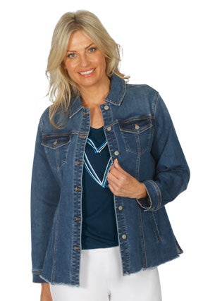 Summer weight Denim jacket with collar breast pockets and  slit pockets also on the front, metal buttons and fray hemline.