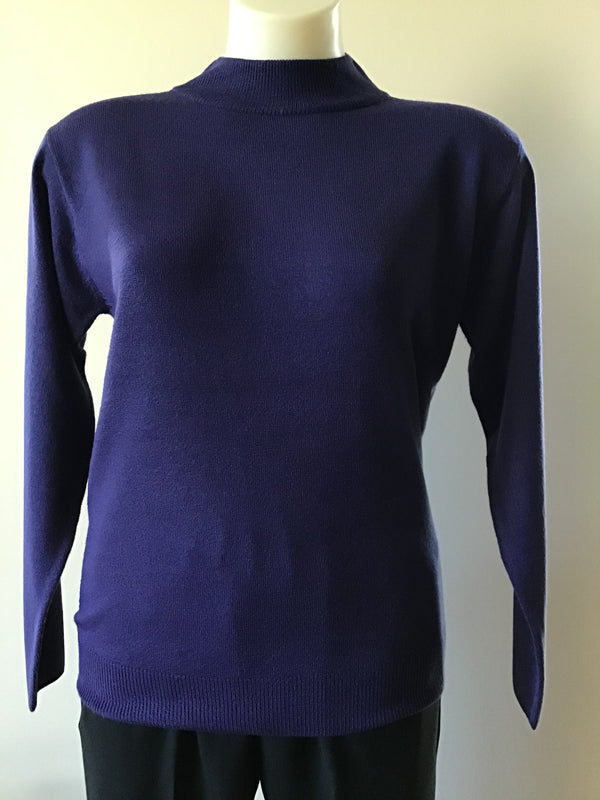 100% Acrylic Hi Crew jumper with ribbed neck line and band on sleeve and bottom.  A great weight for under jackets or dress up with a necklace or scarf.