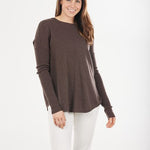 The curved hem crew neck pullover with dropped shoulders and style lines down the front and back is flattering in all body types and perfect for layering. Very soft and warm due to the Merino Wool/Cashmere yarn.