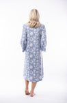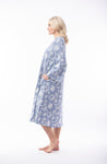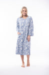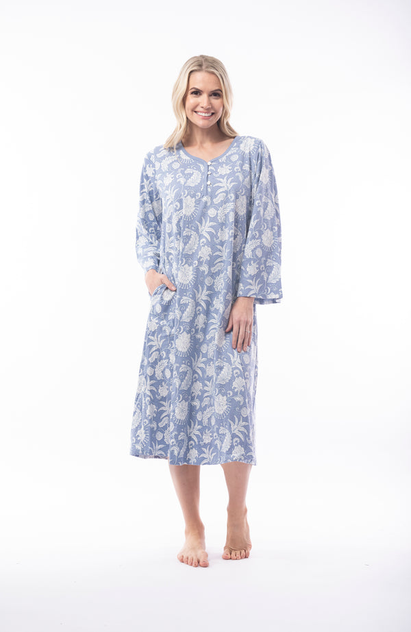 Nighty by Victoria's Dream by Orientique FABRIC: 100% COTTON INTERLOCK Round neck nighty in a blue and grey print with a powder blue trim around the neck and button tab,...