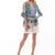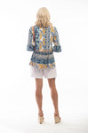 V Neck shirt with a 3/4 sleeve with a frill and a large frill on the body which has a button through opening. Navy blue, black, mint, white, yellow, and a touch of red print.