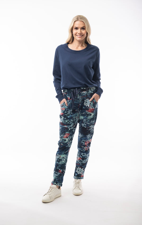 Pants by Orientique FABRIC: 100% CERTIFIED ORGANIC COTTON Printed Terry pant with Elastic and draw string waist band, with 2 pockets and a small cuff, in a very comfortable stretch...