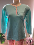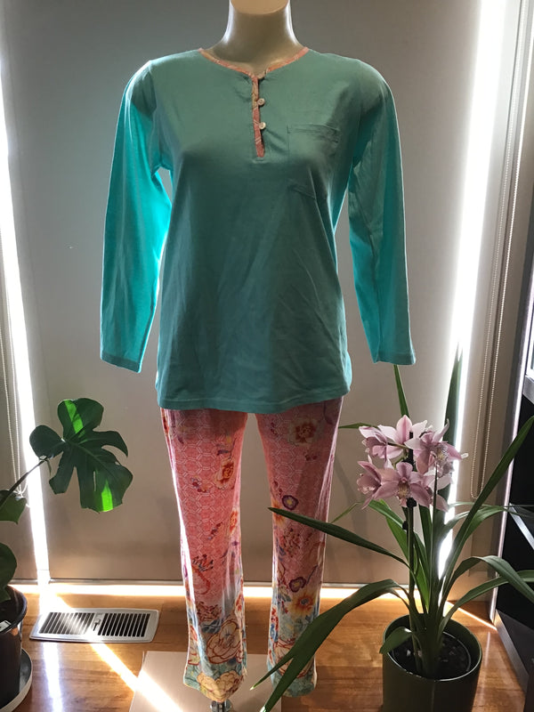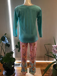 Aqua Top with a floral piping around the neck and button tab to match the bright floral pants with an elastic waist and tie and 2 side pockets and also a breast pocket on the top.