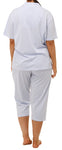 Shirt style pyjamas with a collar button front and 1 pocket on the front, pull on pants with elastic waist, just below the knee length. Blue with a small white polkdot.