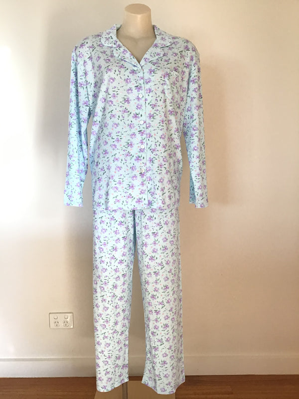 Polyester Cotton Interlock with a shirt maker top with a collar and long sleeves, with a long leg pant with elastic waist, a lovely warm and comfortable pair of pyjamas for winter.