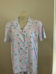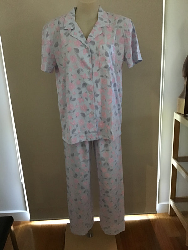This pyjama has a shirt maker style top with a collar short sleeve and buttons down the front with 1 breast pocket, long pants with an elastic waist.