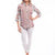 Blouse with a collar and 7/8th length sleeve that has a button and tab so it can be rolled up, in a cream background color with aqua and pink print with a different print panel down the front.