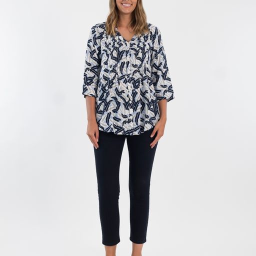 V-neck shirt with pintucks down the front, button opening down the front with 3/4 sleeves, navy blue and white print.