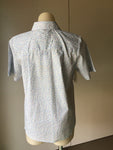 Short sleeve blouse with a collar, button tab and button through, yoke across the back with 2 small pleats to give a bit of fullness across the back. Liberty print in white background and pink and blue flowers.