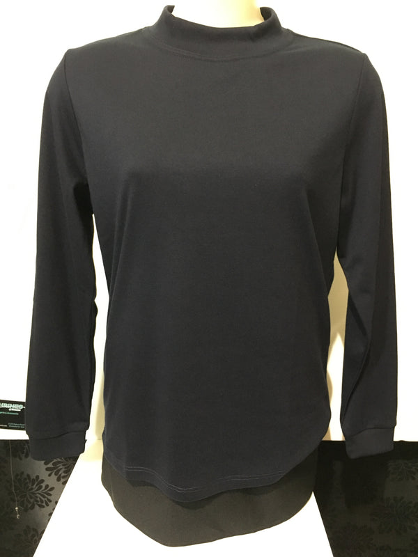 Dark Navy Skivvy with Hi crew neck and Long sleeves with a cuff, 35% Cotton 65% Polyester. This Skivvy looks black in the photo but is a Dark Navy.