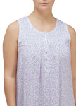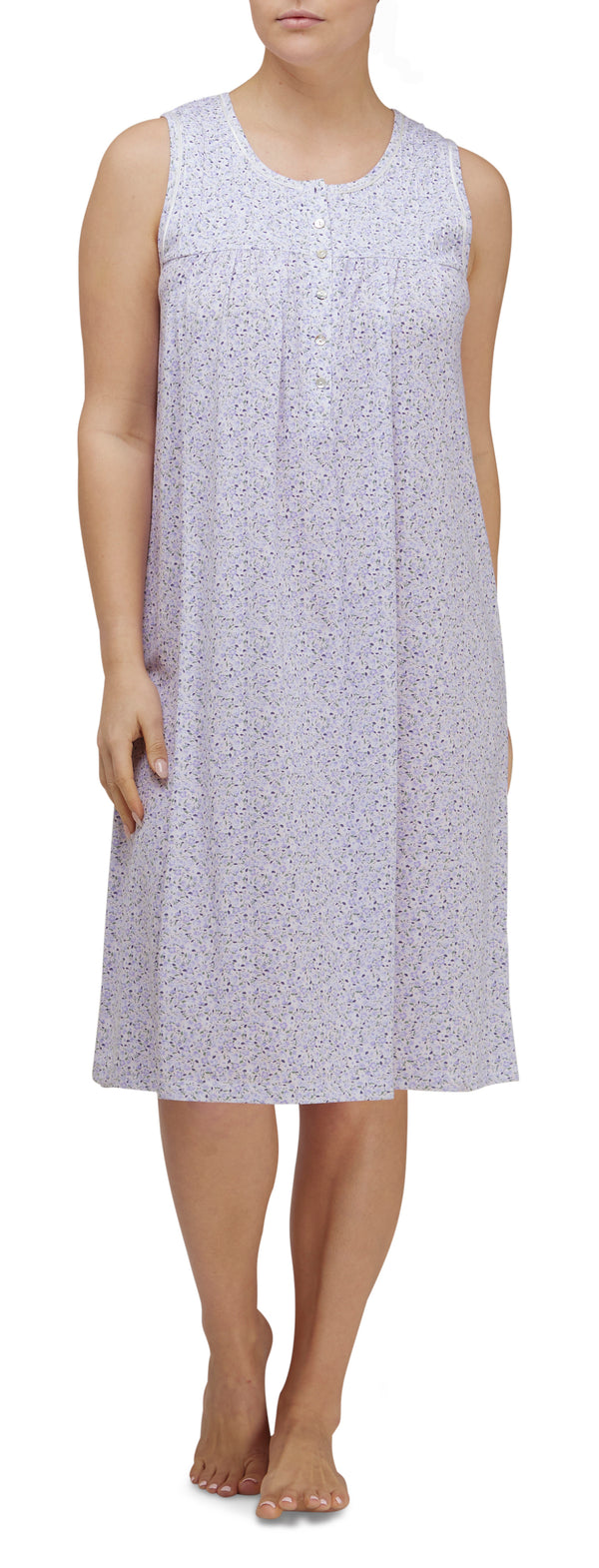 Sleeve less round neck nighty with 6 buttons down the front and piping around the neckline and armhole, knee length. A cool comfortable fabric and style for summer.