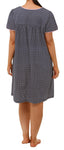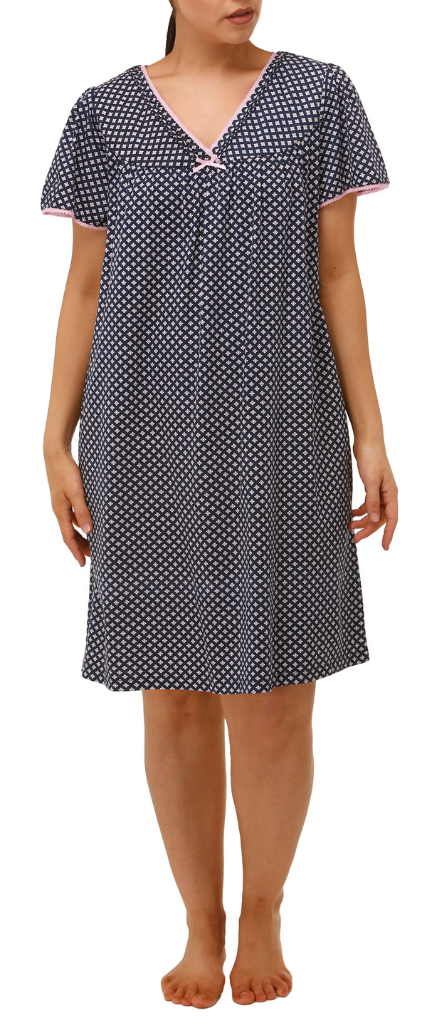 V neck nightie with 3 pintucks on the neckline also with a short bell shape sleeve, Navy background with white and pink fine triangle print with a fine pink lace trim on the neckline and sleeve.