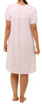 Nightie by Schrank FABRIC: POLYESTER COTTON INTERLOCK Round neck line nightie on a yoke with pin tucks across the yoke, bell shaped short sleeves, knee length, pink with white polkdot...