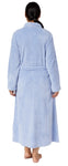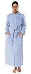 Button Through dressing gown with a collar, 2 pockets and tie belt, this gown has white piping around the collar and on the pockets, can be worn without the belt.