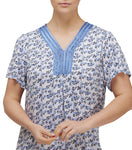 Viscose is a natural fibre and is very cool and comfortable to wear, it is very soft and wears very well. This nighty is in a fine print and has a V-Neckline in a plain mesh and satin ribbon trim, short sleeves, knee length.