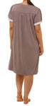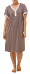V Neck nightie with a stretch lace trim on the neckline and short sleeve, taupe with a fine white spot and stitch feature from the shoulder and over the bust with a yoke across the back and some gathering to give a bit of fullness, a very soft and comfortable fabric to wear.