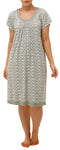 Round neck Nightie with round neck and short sleeve, Viscose elastane is a cool and very comfortable fabric to wear and it washes and wears beautifully, Aztec print in Sage and cream with a plain sage trim on the neckline and hemline.