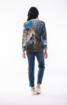 V Neck top with long sleeves and Khaki Aqua taupe and purple print, classic length.