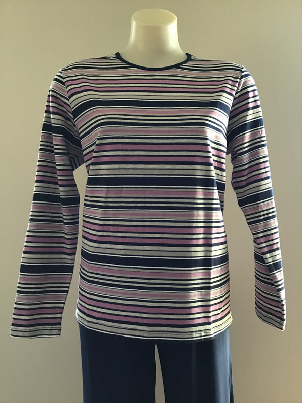 Renoma Label - 95% Cotton 5% Elastane Stripe top in Navy pink white & silver stripe. With a round neck and long sleeves a great top for under jackets or...