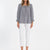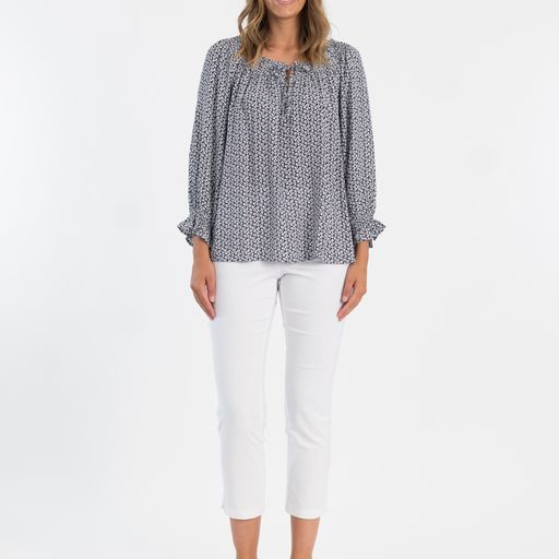 Peasant style shirt with elastic gathered neck line and elastic on the longer length sleeves with a little frill, navy and white small flower print.