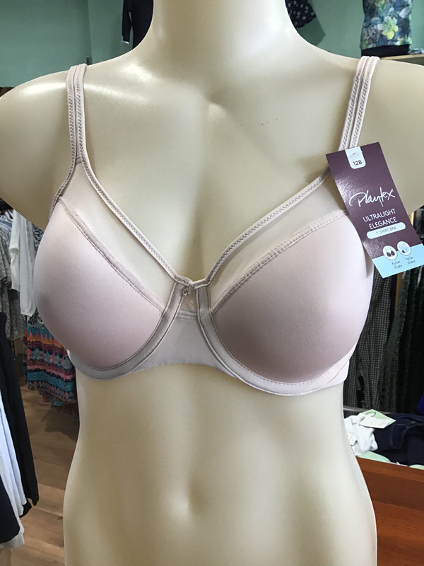 Breathable lightweight cups for added comfort. Built in cup sling for added support.  2 ply back for smooth appearance under clothes.  Underwire Bra.