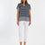 Striped V-neck to with short sleeves with a smaller stripe cuff to match the slightly flared cuff on the body, dark navy with a white stripe.
