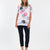 Short sleeve layered top with a round neck and short sleeves, white background color with a navy and pretty pink circle print overlay with a white underlay on the body.