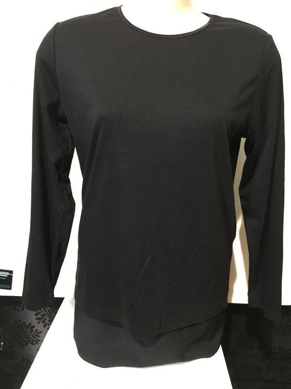 35% Cotton 65% Polyester Round Neck top with Satin Trim neck and long sleeves.