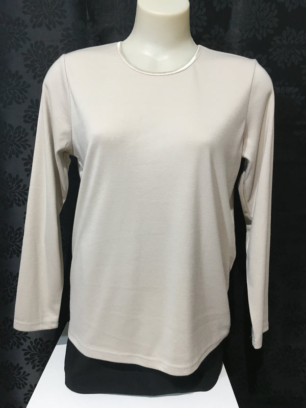 35% Cotton 65% Polyester Round neck top with satin trim and long sleeves.