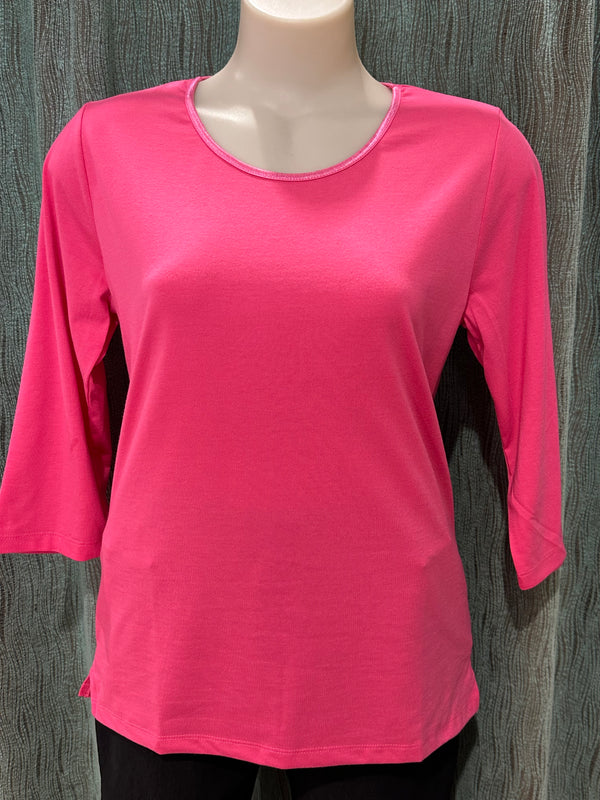 Round neck top with a satin trim around the neckline, 3/4 sleeve and a small split at the sides of the body, a great trans seasonal weight and a good weight for under jackets.