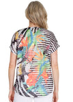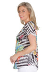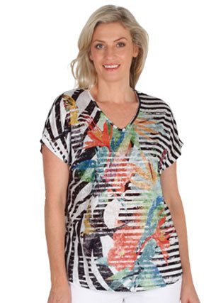 Drop shoulder top by Sportswave FABRIC: 80% POLYESTER 20% VISCOSE V neck top with a drop shoulder in a burnout fabric in a black and white stripe with a floral...