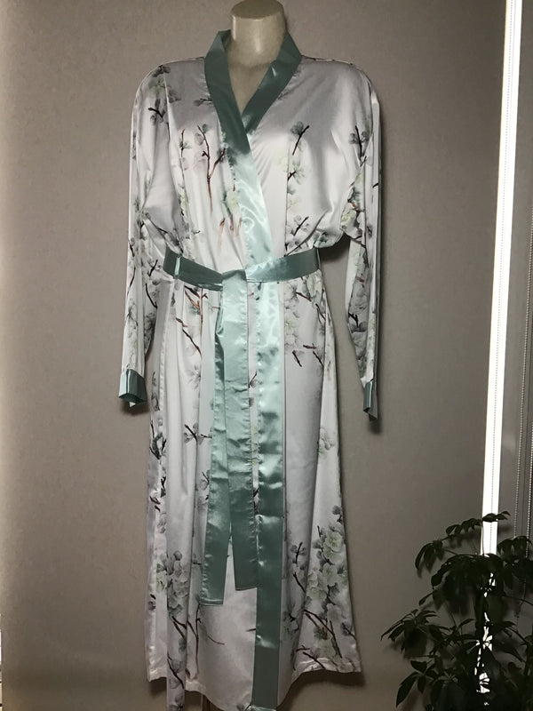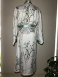 Envy Nightwear Polyester Satin wrap gown with long sleeves and calf length has  a cream back ground with a very pretty print and a green cuff on the sleeves, band...
