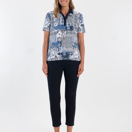 Printed Polo top by Renoma  FABRIC: 95% COTTON 5% ELASTANE INTERLOCK  Polo top with a printed bodice and navy collar and button tab, a great top for the golfing ladies. ...