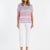 Multi colored top with zig zag print, round neck with a pearl stud trim, short sleeves and classic length.
