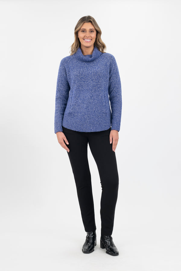 Jumper with a cowl neck, plain style in a wisteria and white fleck yarn with a wide rib band on the body, sleeves and cowl neck, this garment has 2 slit pockets in the front. A warm and cosy jumper for winter.