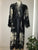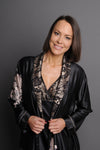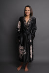 Polyester Satin wrap gown with black back ground and beige print has a long sleeve and is mid calf length, shawl collar and tie closing.