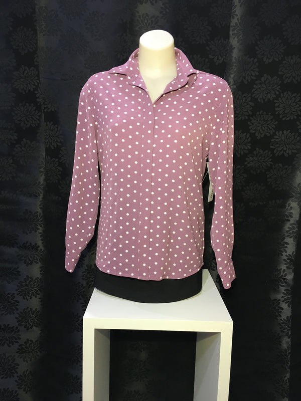 AUSTRALIAN MADE.  100% Polyester Spot blouse with long sleeves with a cuff and button front closure has a hidden button lapel and collar