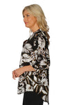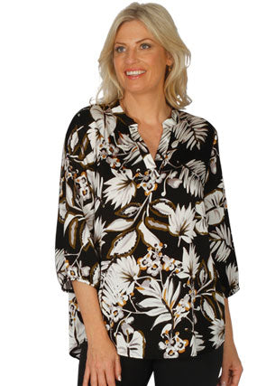 Shirt by Emily Adams FABRIC: 100% POLYESTER Round neck shirt with V opening in the front 3/4 sleeve with elastic at the hem, on a yoke and has a scooped...