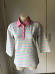 Polo Top by Murals FABRIC: 100% COTTON INTERLOCK WITH WOVEN COTTON COLLAR 3/4 Sleeve Stripe Polo top in pastel colors and pink collar. Made in China
