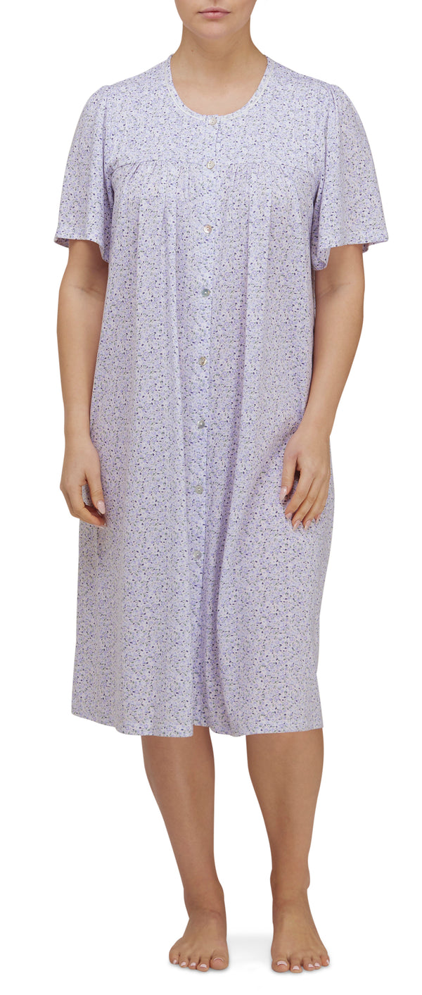 Brunch coat by Schrank FABRIC: POLYESTER COTTON INTERLOCK Brunch coat is button down the front with a round neck short sleeves and pockets this can be worn over a nighty...