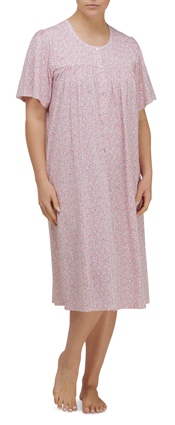 Brunch coat by Schrank FABRIC: POLYESTER COTTON INTERLOCK Brunch coat is button down the front with a round neck short sleeves and pockets this can be worn over a nighty...